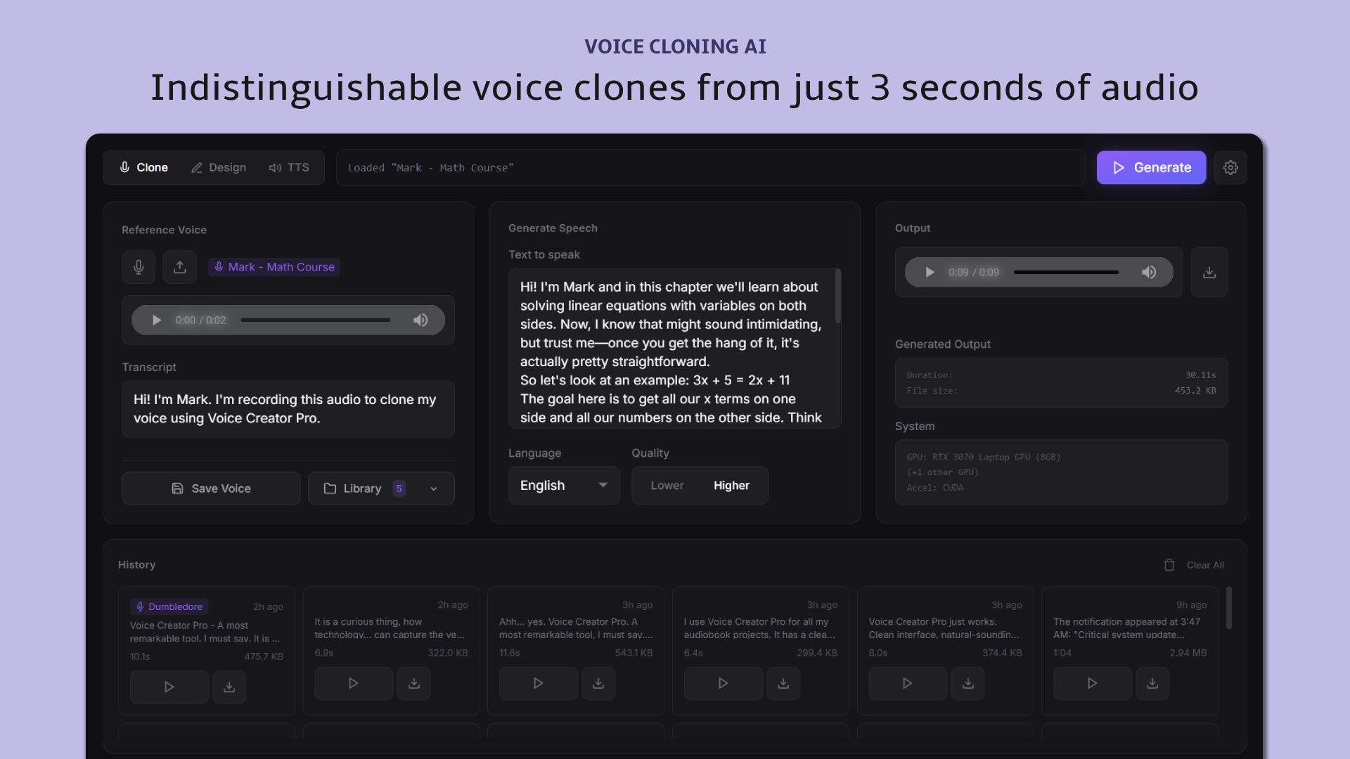 Upload a short audio clip and generate new speech that sounds indistinguishable from the original.