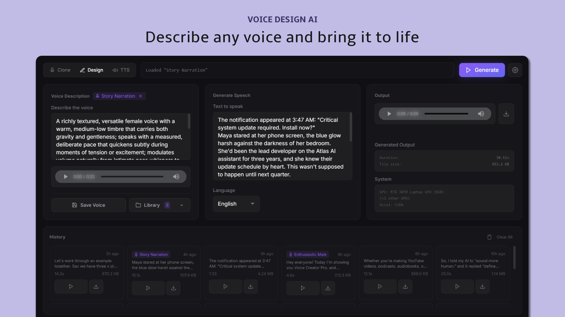 Don't have a sample? Simply describe your ideal voice. Whether you need an energetic narrator, a calm storyteller, or a professional presenter — just describe the voice you want and generate natural sounding speech.